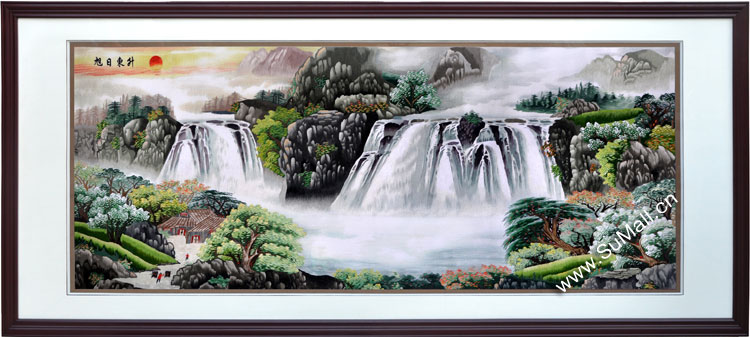 【旭日東升】瀑布寓意財源滾滾;左右各有兩個瀑布,寓意左右逢緣事業生機旺盛;水潭寓意聚寶盆;旭日寓意鴻運當頭;作品左邊之樹為招財樹,右邊之樹為擋災樹;整幅作品滿含鴻運當頭,財運如浩浩瀑水,生生不息之意。