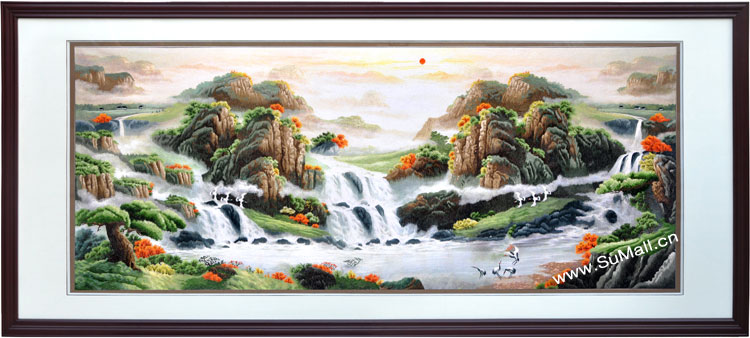 【漓江山水】李可染山水畫的代表作,也是畫漓江山水最為成熟之際創作的,畫中萬山重疊,無數船只溯流而進,除了逆光造成的山石之“黑”,豐富的層次和強烈的光線效果,形成了李可染繪畫中“逆光山水”的獨特風貌。結合蘇州傳統手工刺繡,以《漓江山水》畫為原型創造的大幅刺繡畫,針法平整均勻,栩栩如生,是開業送禮尚佳之選。