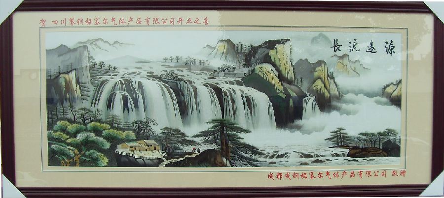 蘇繡裝飾畫案例: 畫框玻璃外可加開業貼贈送單位名稱,祝福詞語等,可見以下案例: