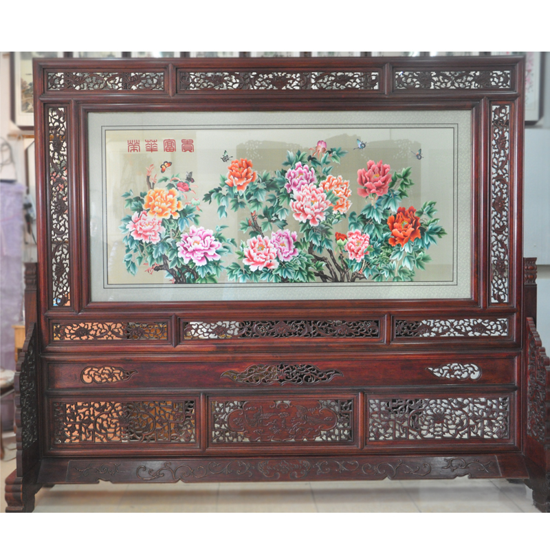 【出廠價】:16800元 【產品名稱】:榮華富貴(雙面繡) 【產品規格】:圖案尺寸寬度200cm,高度100cm 外框整體尺寸寬266cm,高222cm 【產品工藝】:手工刺繡 【產品材質】:真絲面料+菠蘿格木+桑蠶絲線+玻璃