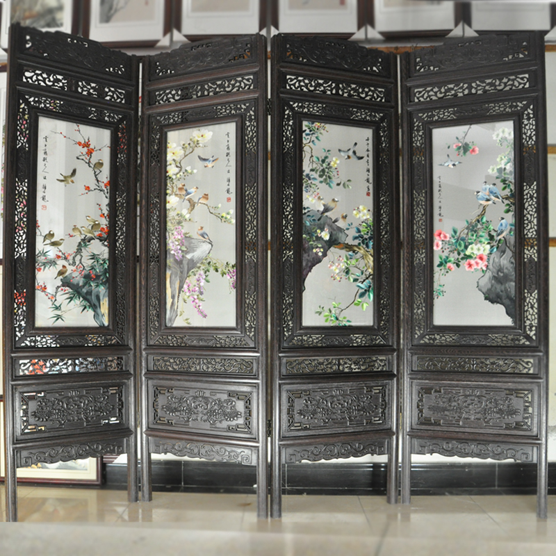 【出廠價】:22000元 【產品名稱】:四扇花鳥(雙面繡) 【產品規格】:圖案尺寸每扇寬度875px,高度2250px 外框整體尺寸寬1500px,高5125px 【產品工藝】:手工刺繡 【產品材質】:真絲面料+雞翅木+桑蠶絲線+玻璃