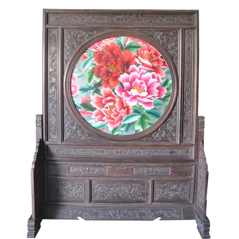 【出廠價】:24000元 【產品名稱】:滿繡牡丹(雙面繡) 【產品規格】:圖案尺寸2500px的圓 外框整體尺寸寬4000px,高5375px 【產品工藝】:手工刺繡 【產品材質】:真絲面料+雞翅木+桑蠶絲線+玻璃